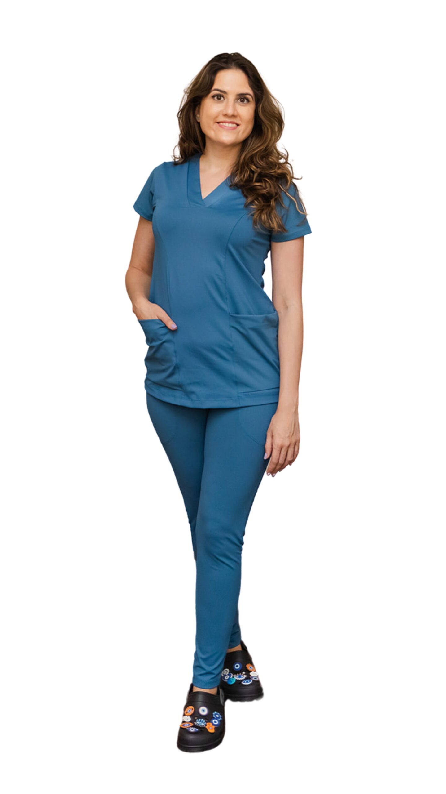 Conjunto cirúrgico feminino (blusa e calça). Blusa com gola arredondada e 2 bolsos frontais.