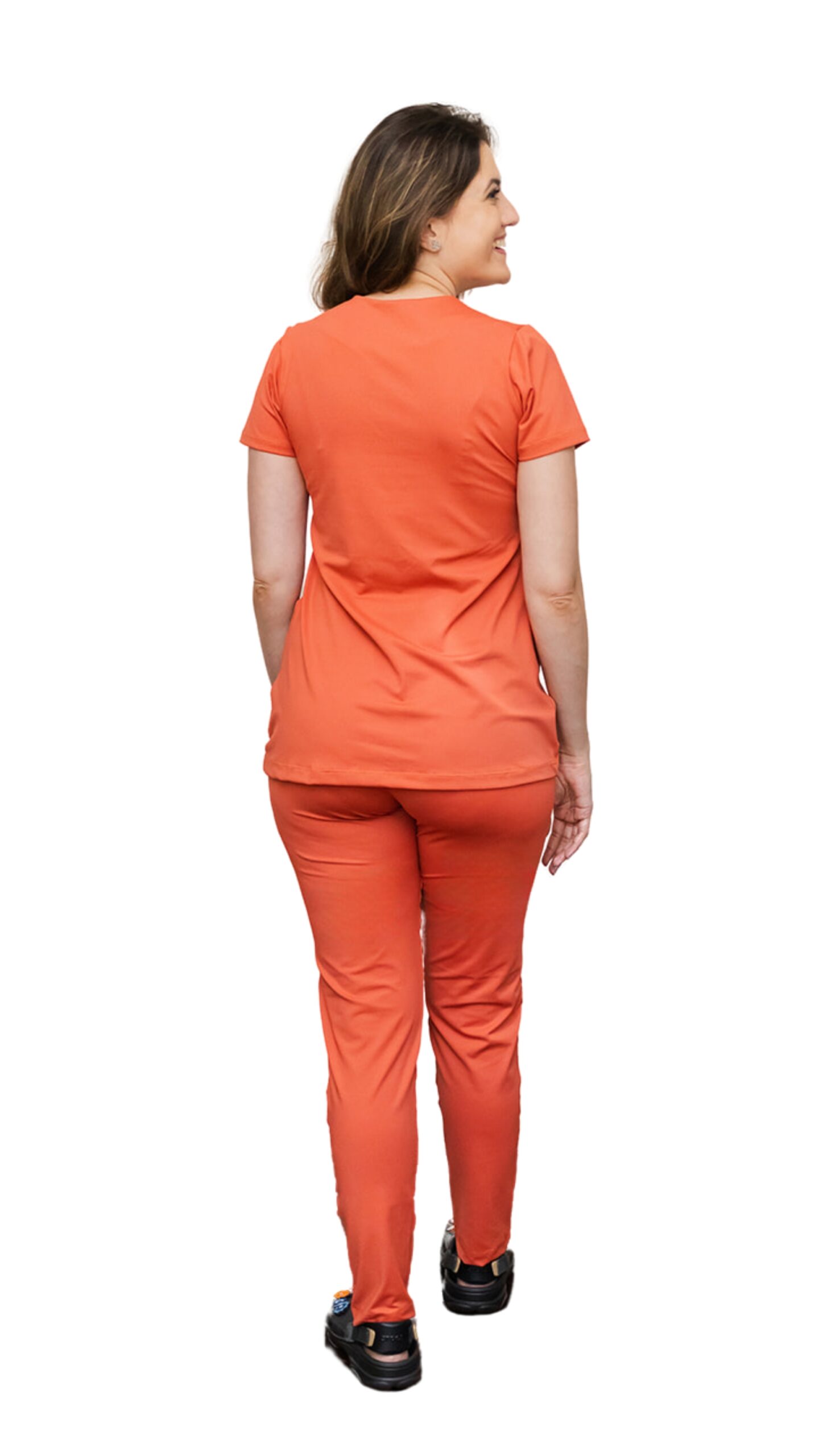 Conjunto cirúrgico feminino (blusa e calça). Blusa com gola arredondada e 2 bolsos frontais.