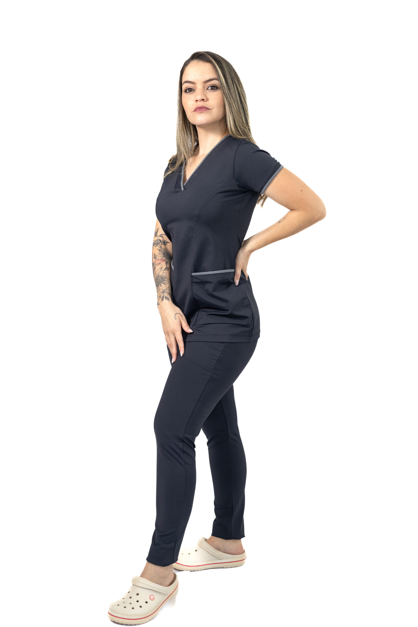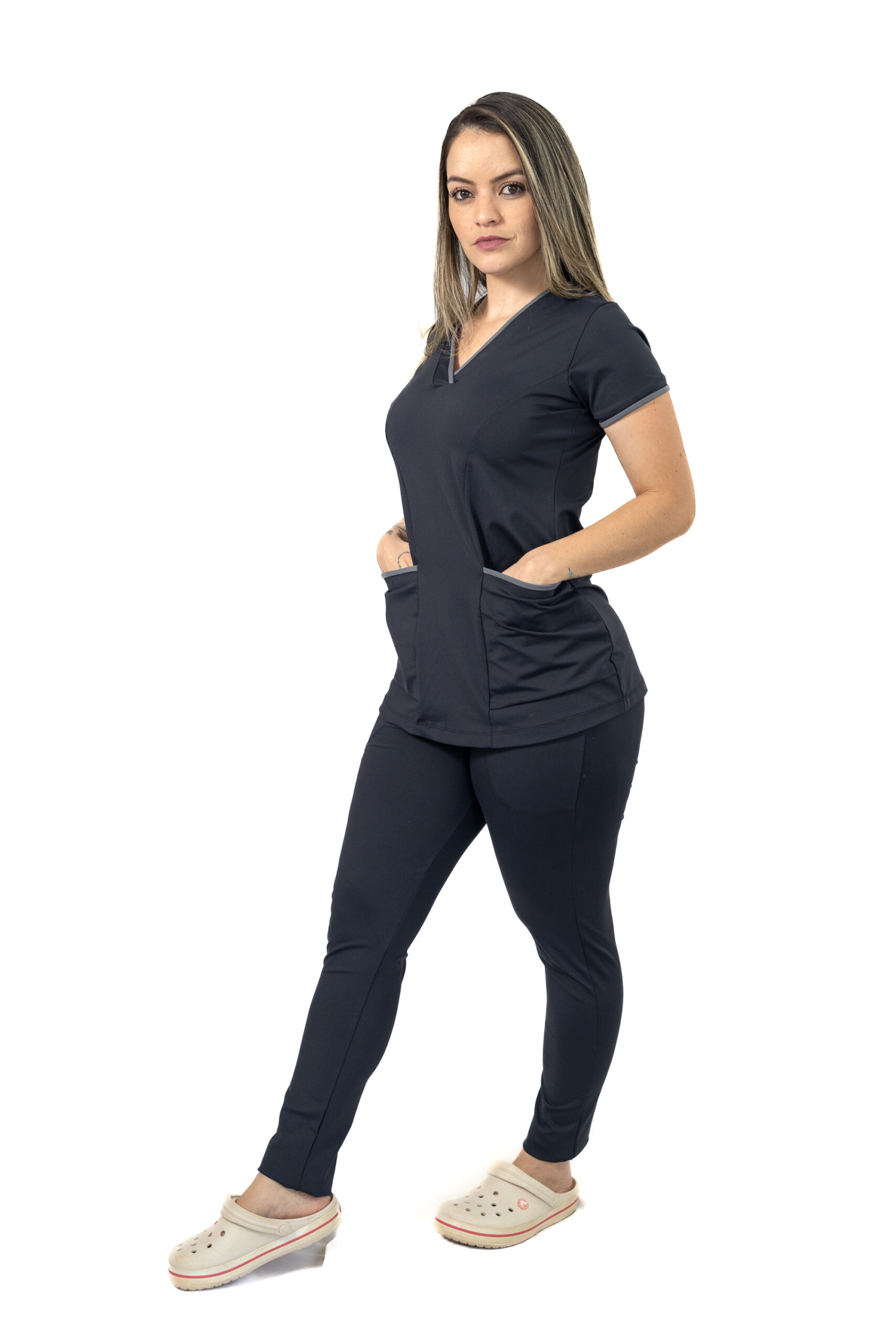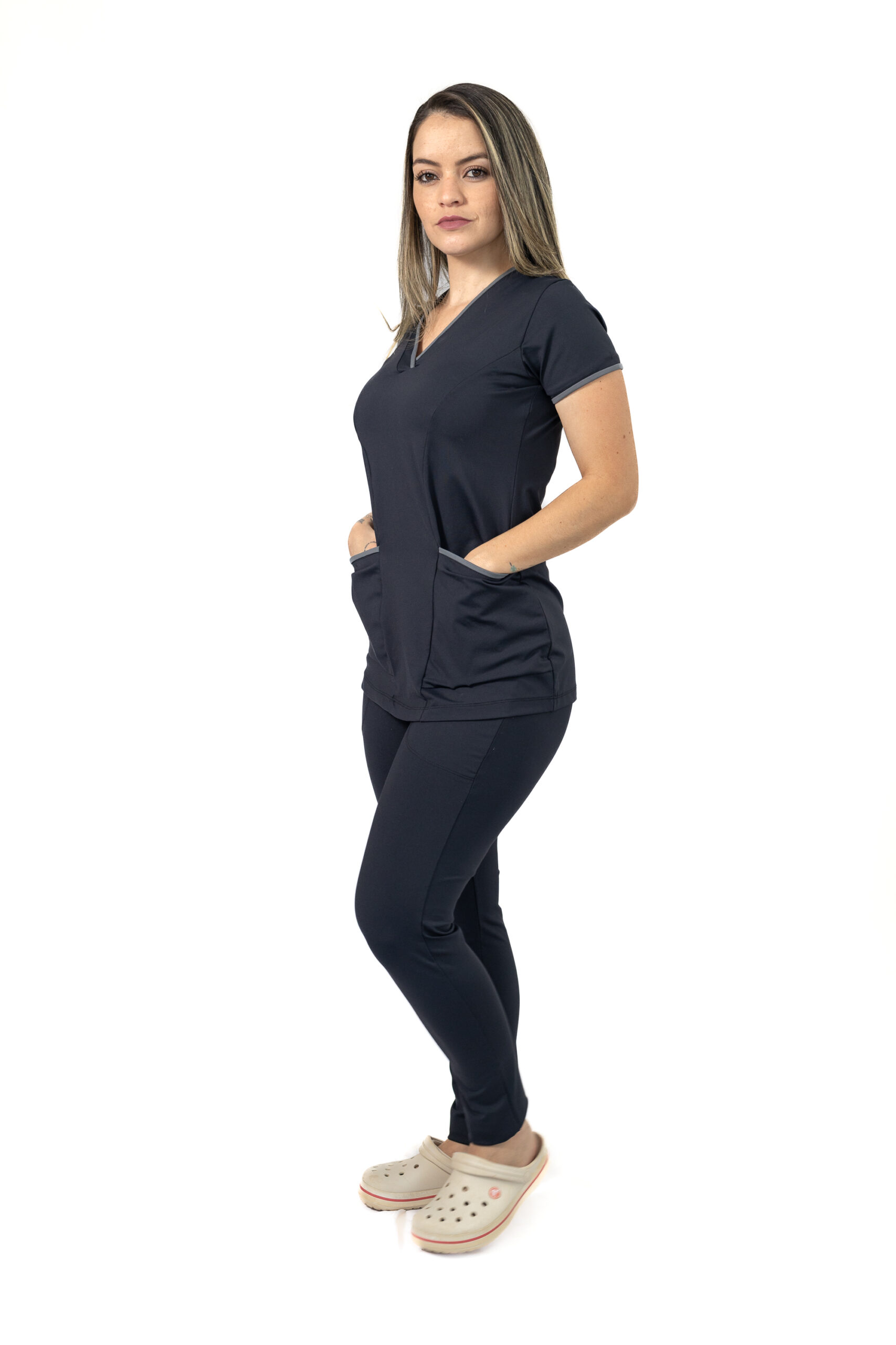 Conjunto cirúrgico feminino (blusa e calça). Blusa com decote em V e 2 bolsos frontais com detalhe em outra cor no acabamento dos bolsos, gola e mangas.