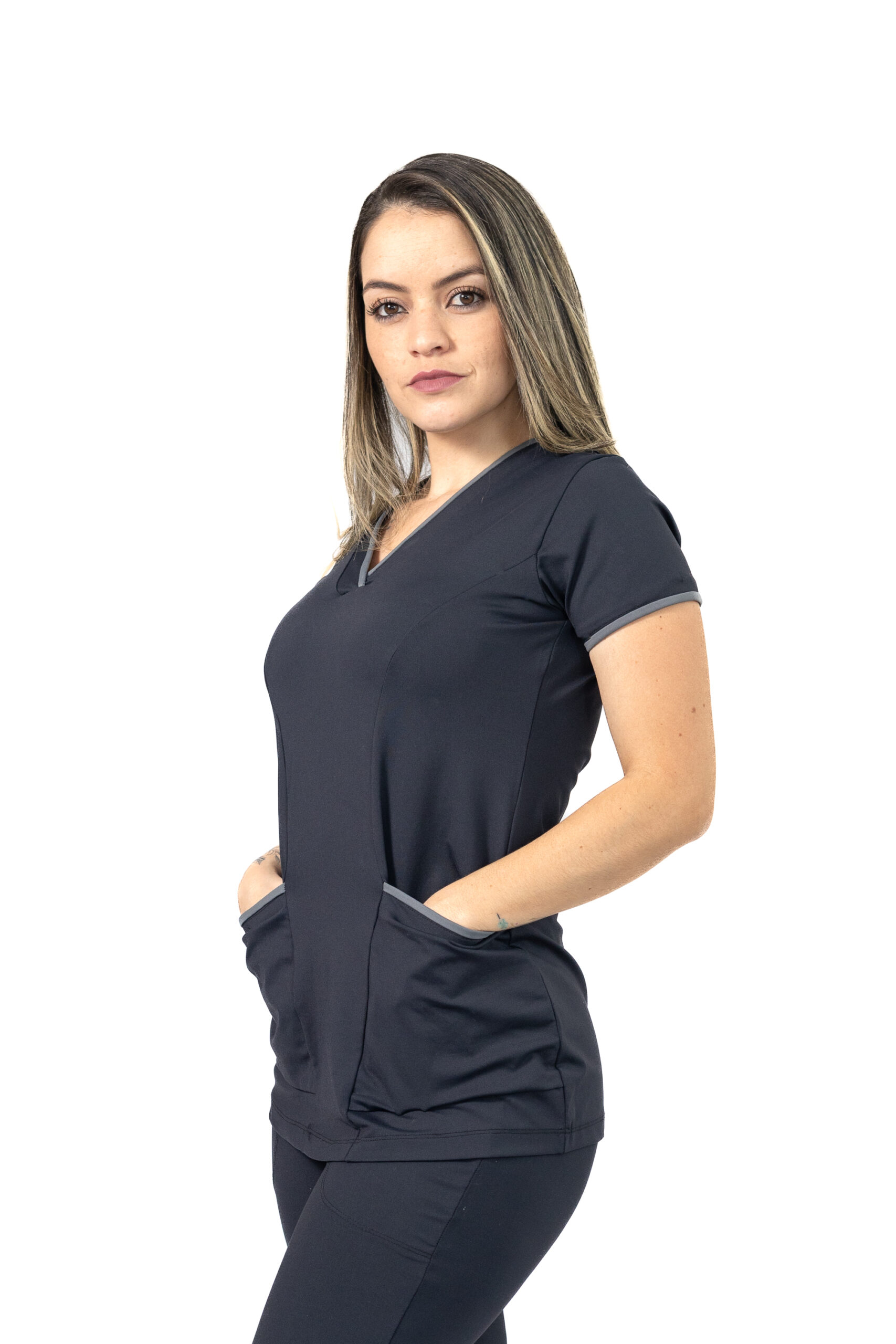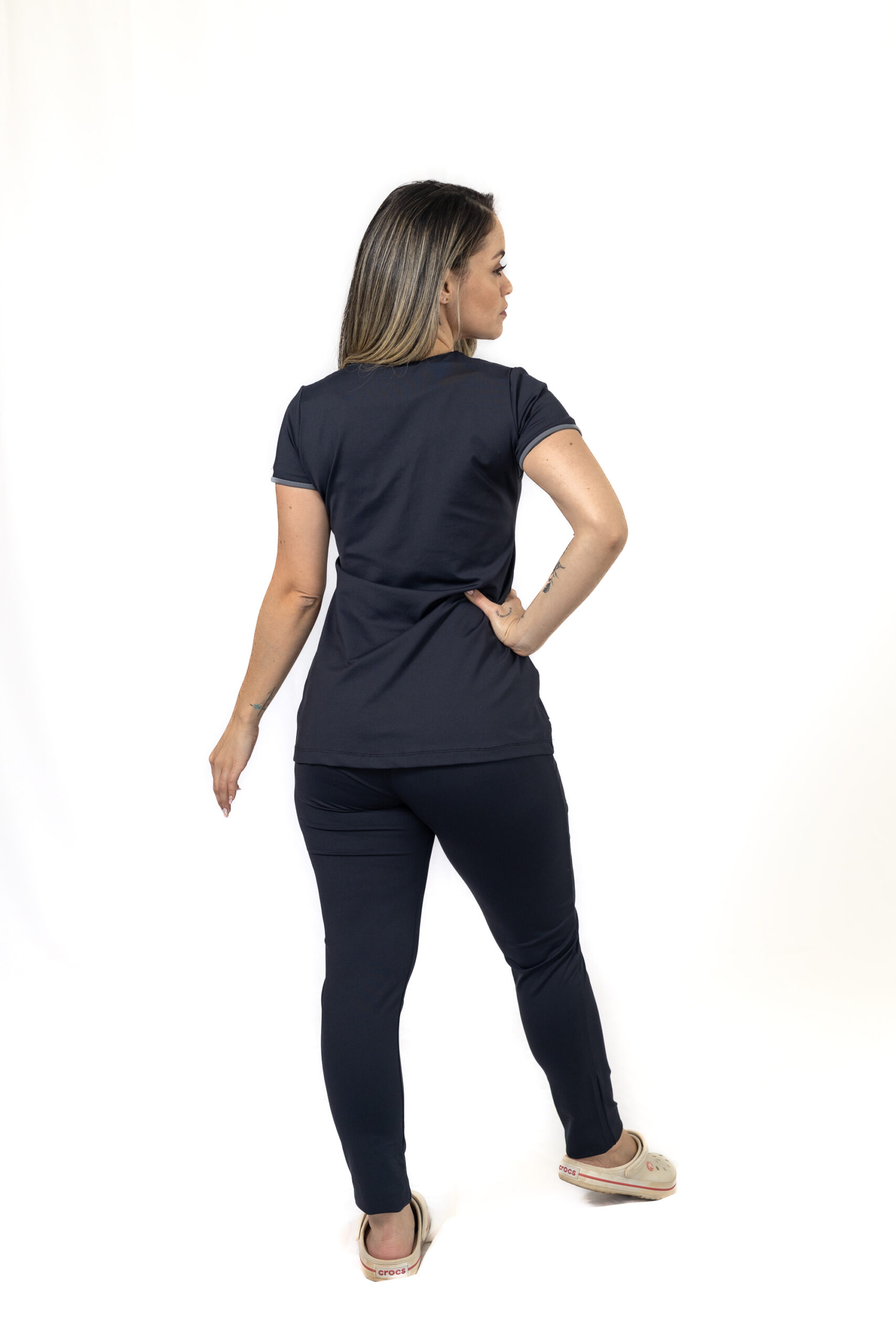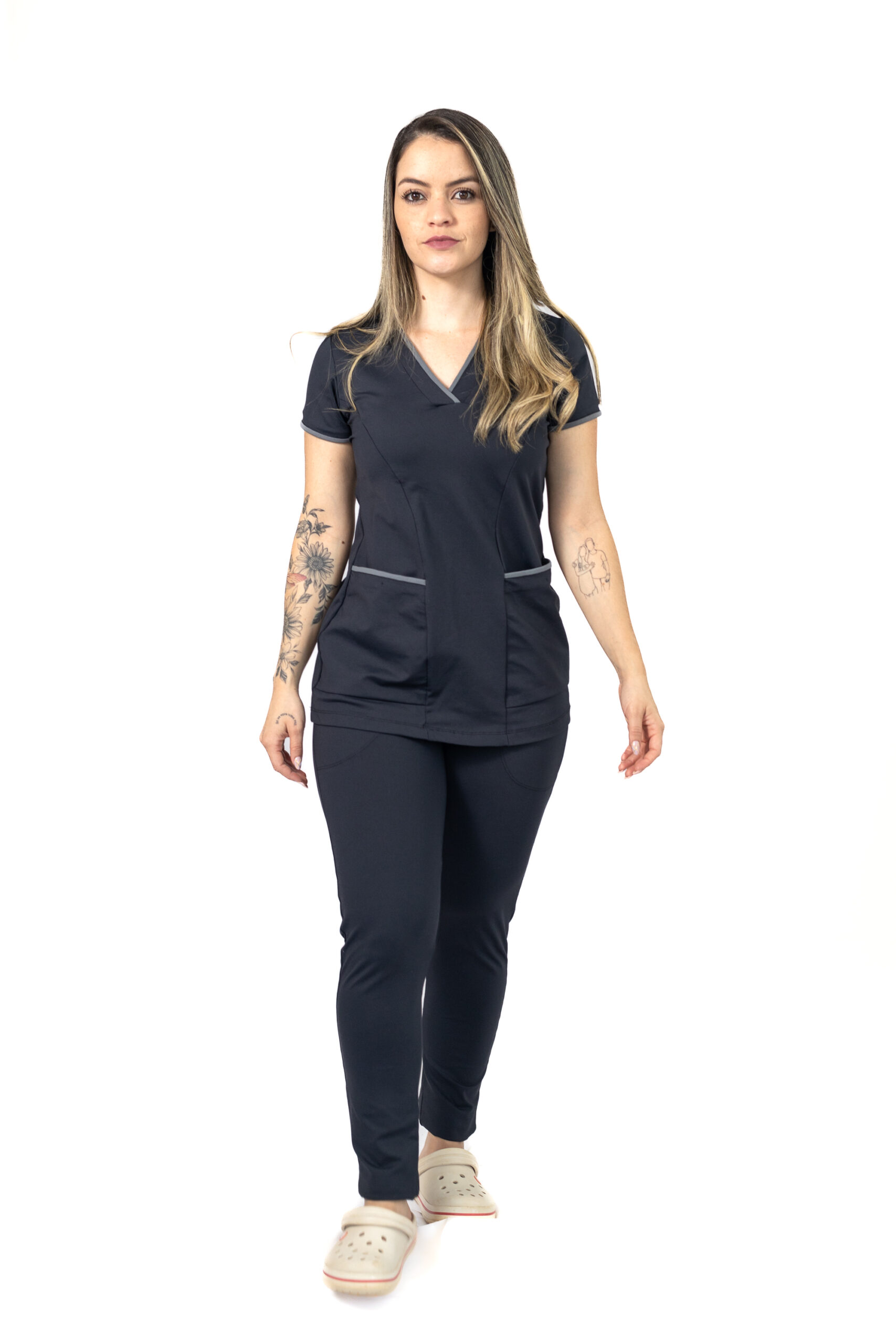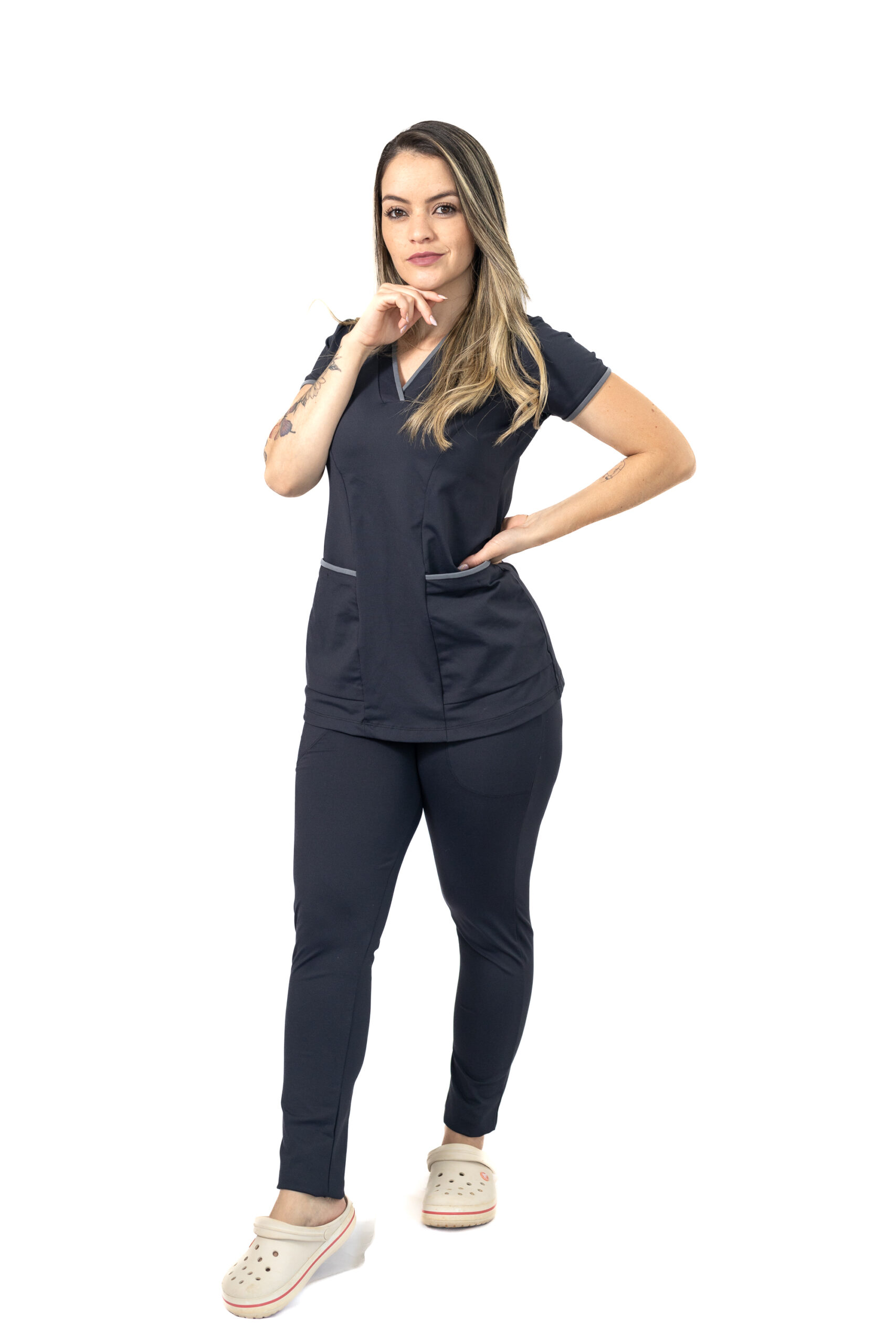 Conjunto cirúrgico feminino (blusa e calça). Blusa com decote em V e 2 bolsos frontais com detalhe em outra cor no acabamento dos bolsos, gola e mangas.