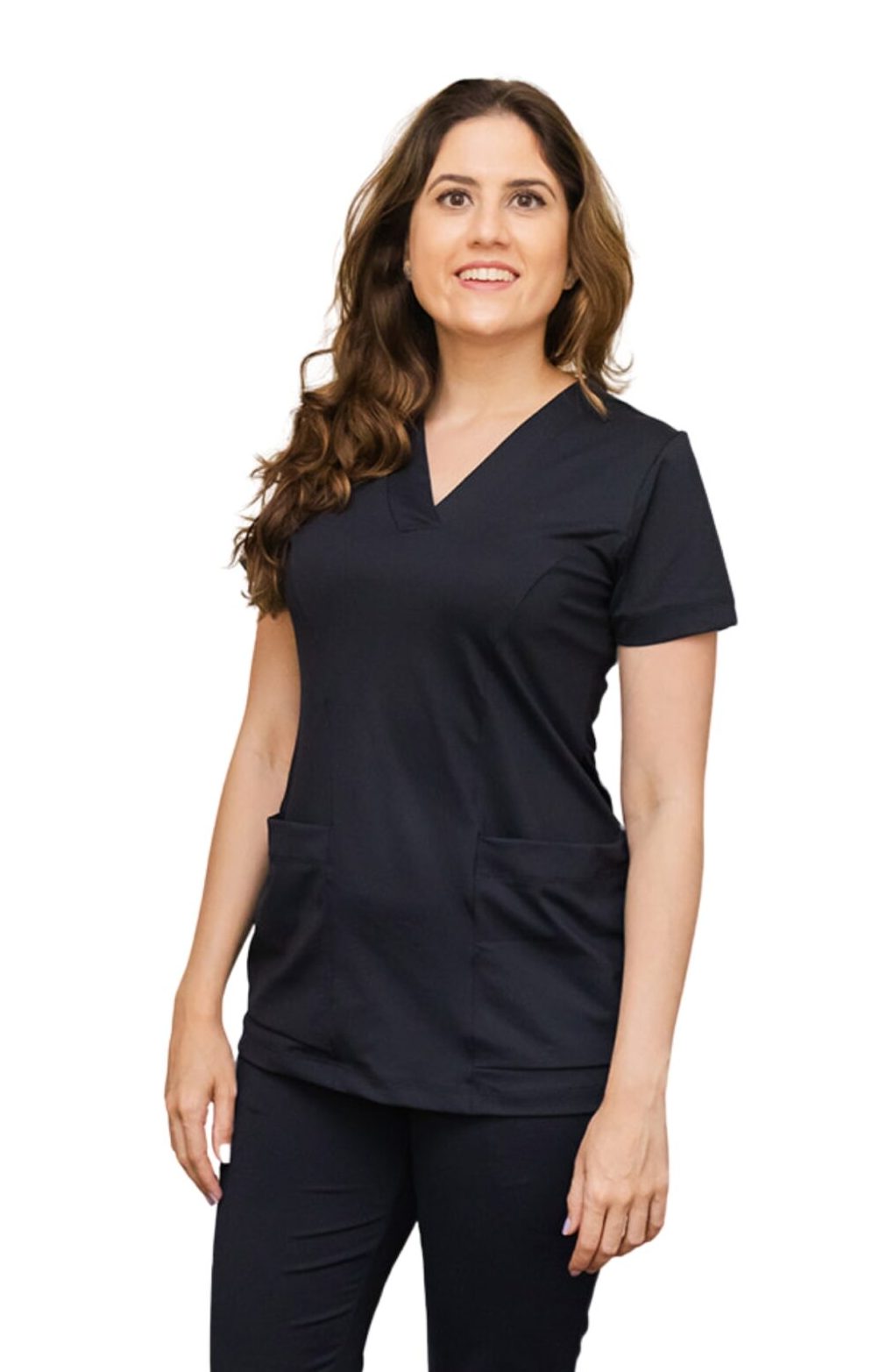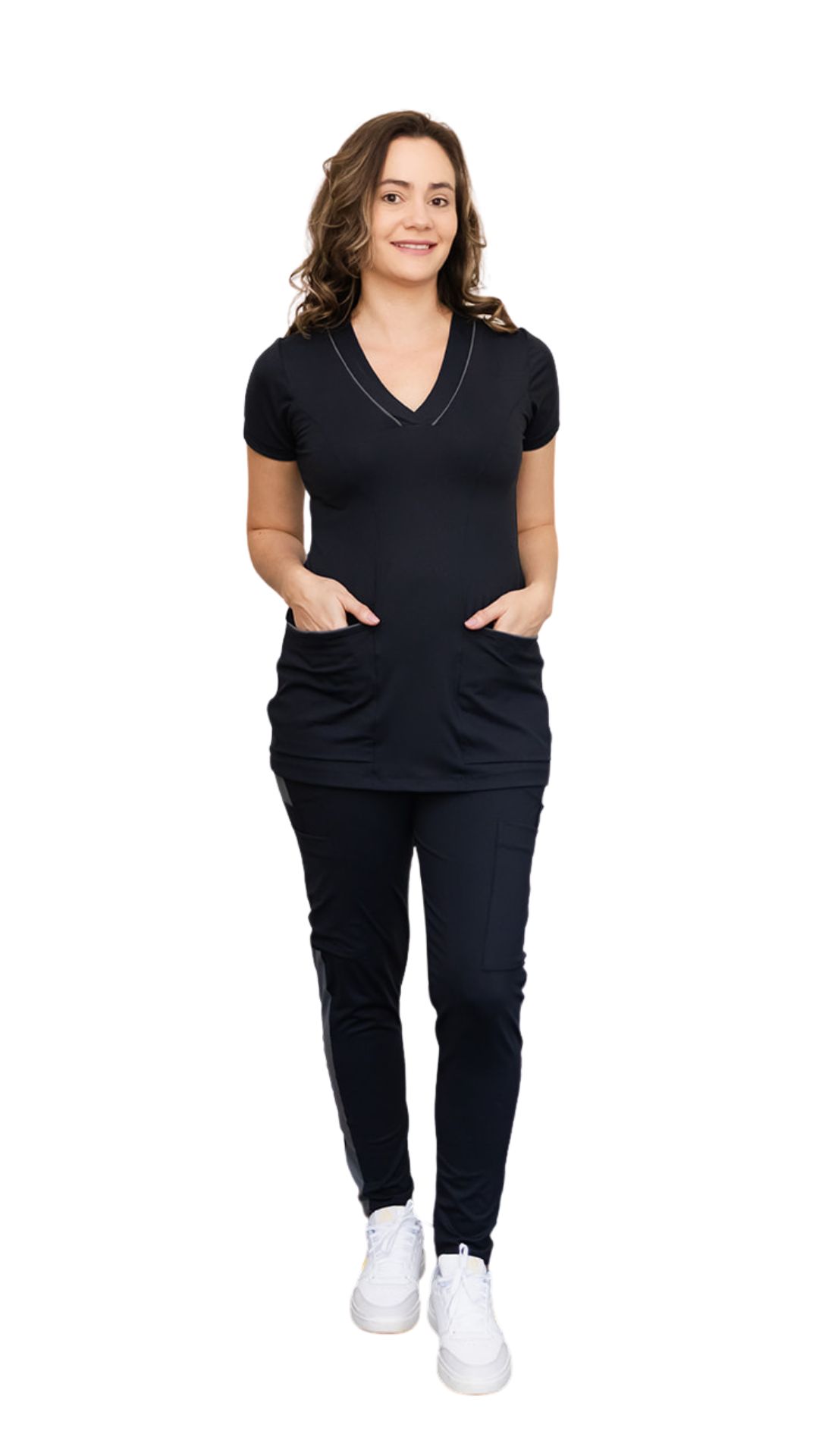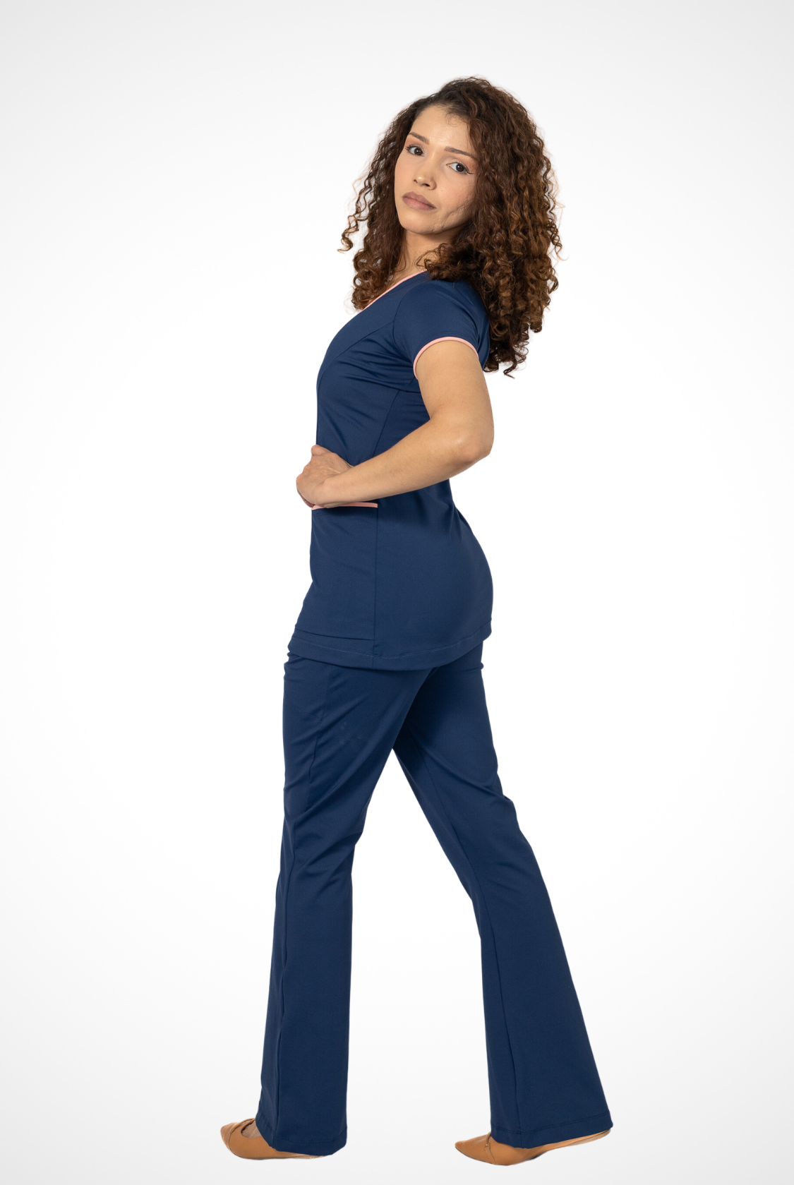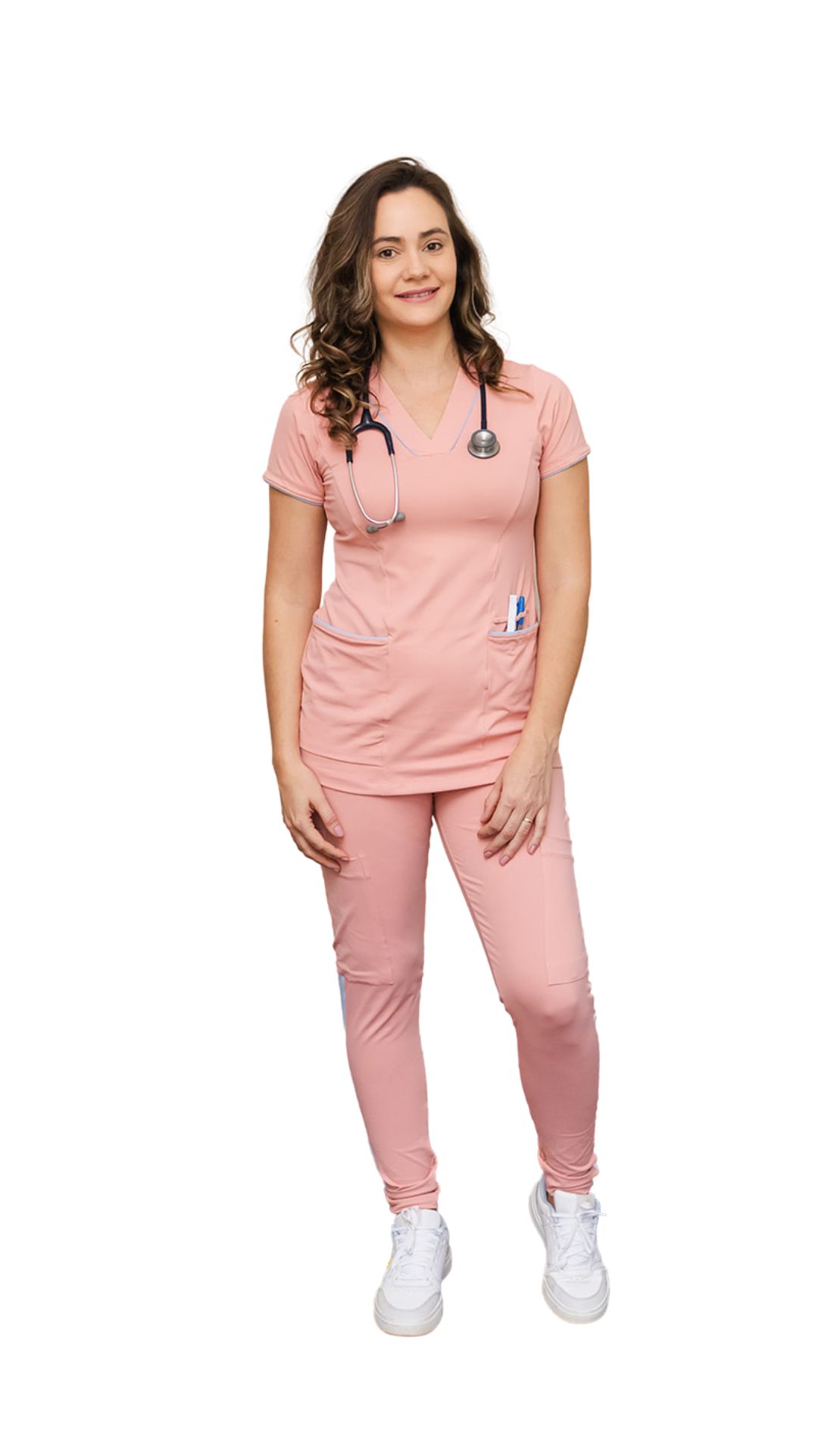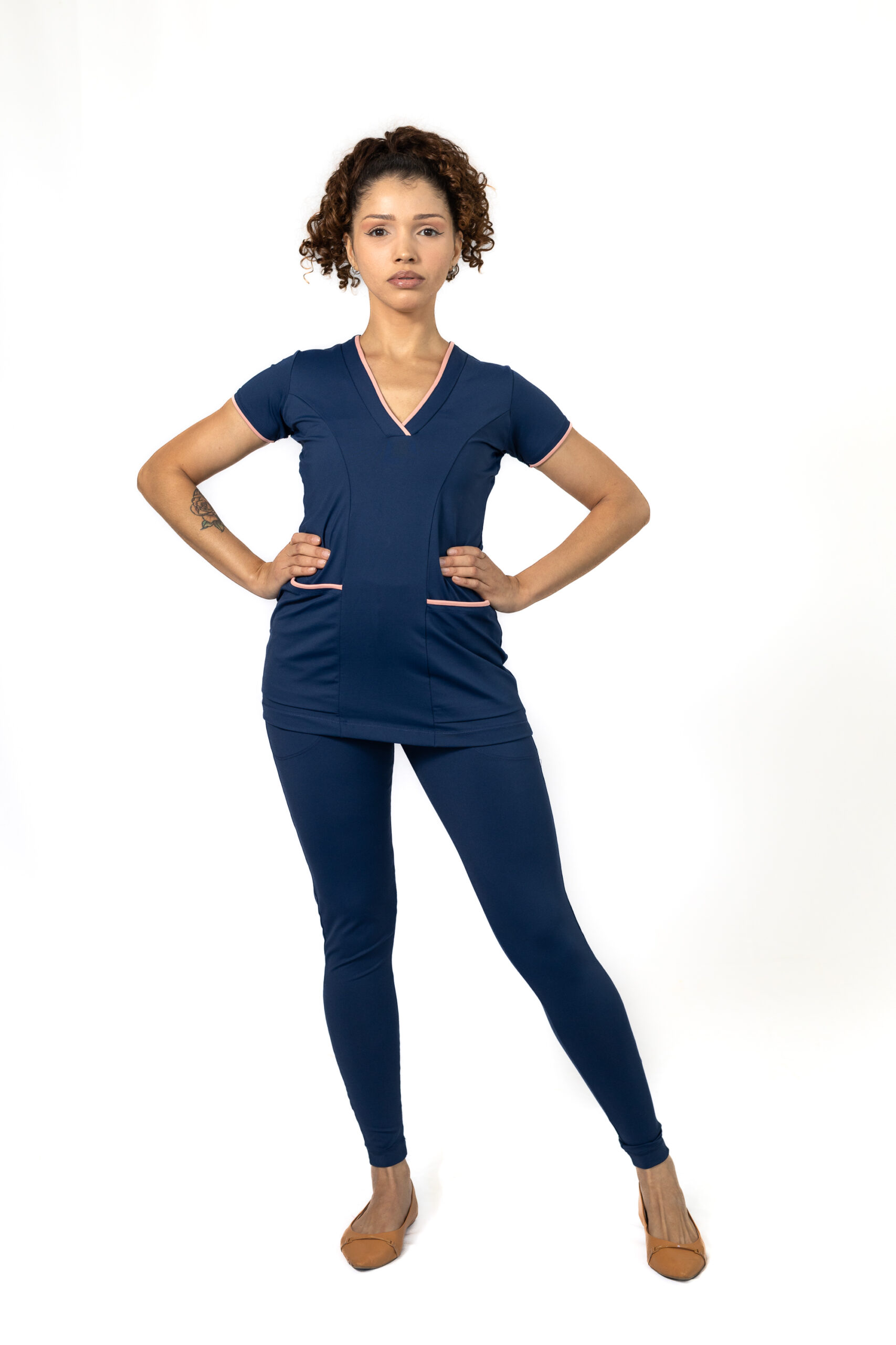 Conjunto cirúrgico feminino (blusa e calça). Blusa com decote em V e 2 bolsos frontais com detalhe fino em outra cor no acabamento dos bolsos, gola e mangas.