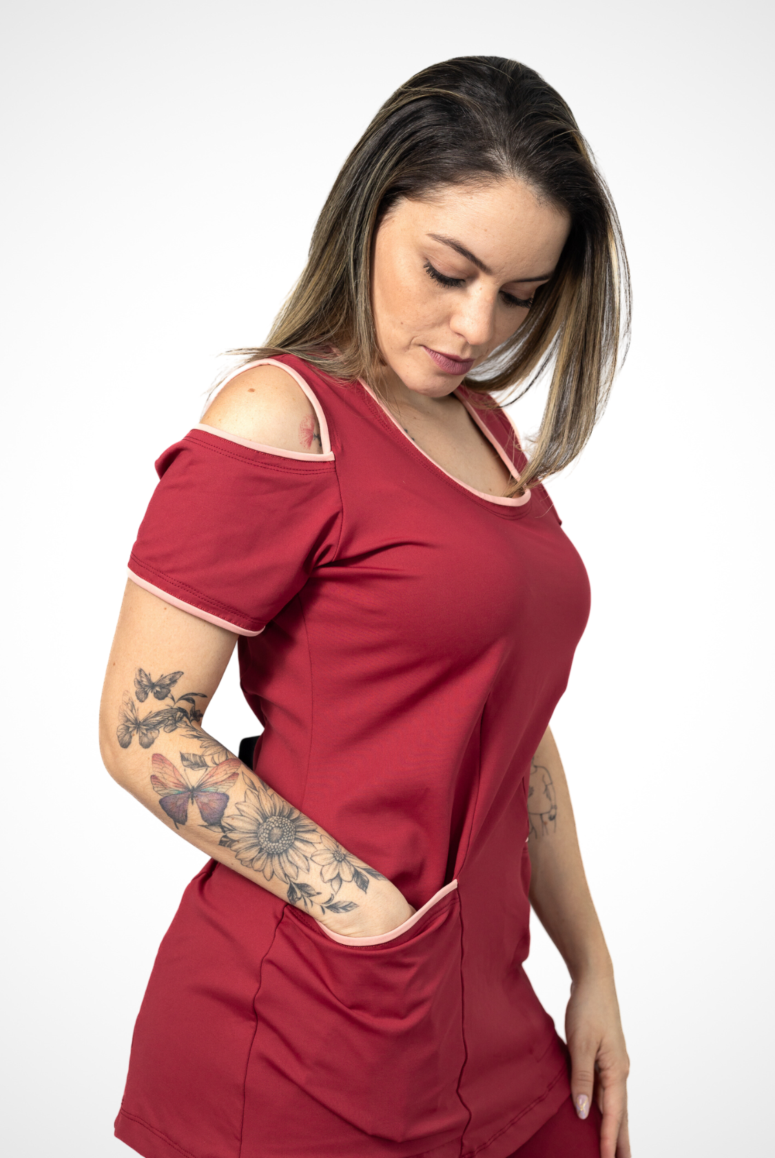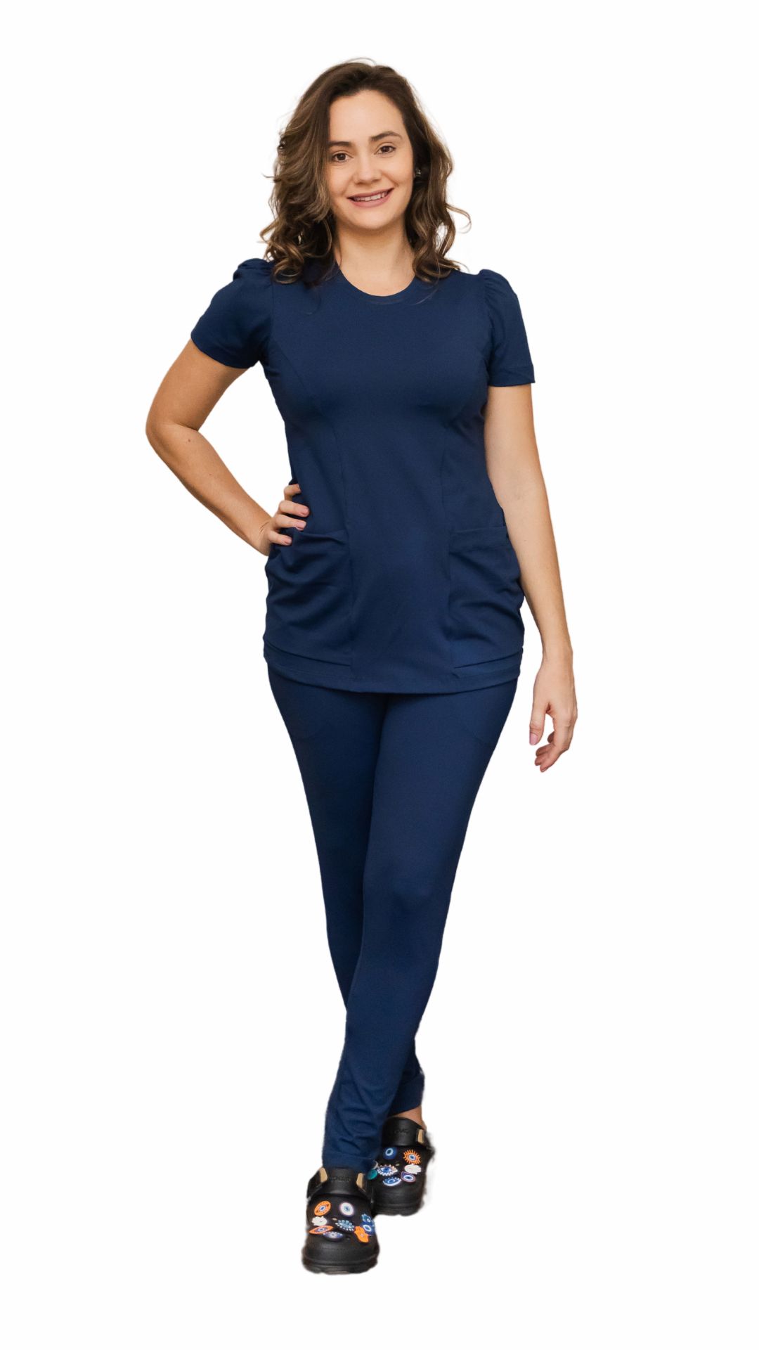 Conjunto cirúrgico feminino (blusa e calça). Blusa com gola arredondada e 2 bolsos frontais.
